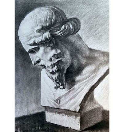 圖片上是一組胸像石膏寫生作品。胸像的寫生不僅儀是比頭像增加了頸肩、衣紋等內(nèi)容.在畫面整體的把握和控制上也對寫生者提出了更高的要求,它需要對更多的細節(jié)進行概括歸納。