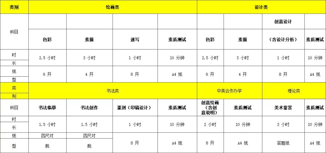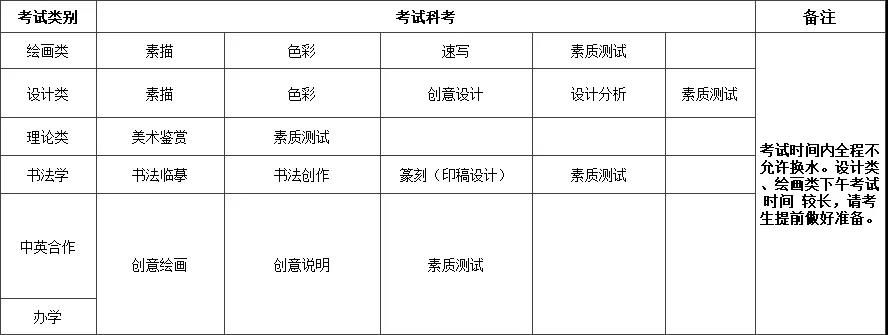 4、繪畫類、設計類、書法類專業總分為 300 分,素描、速寫、色彩、創意設計(含設計分析)、書法臨摹、書法創作、篆刻(印稿設計)各科滿分為 100 分。理論類專業總分為 100 分。中英合作辦學專業總分為 100 分。