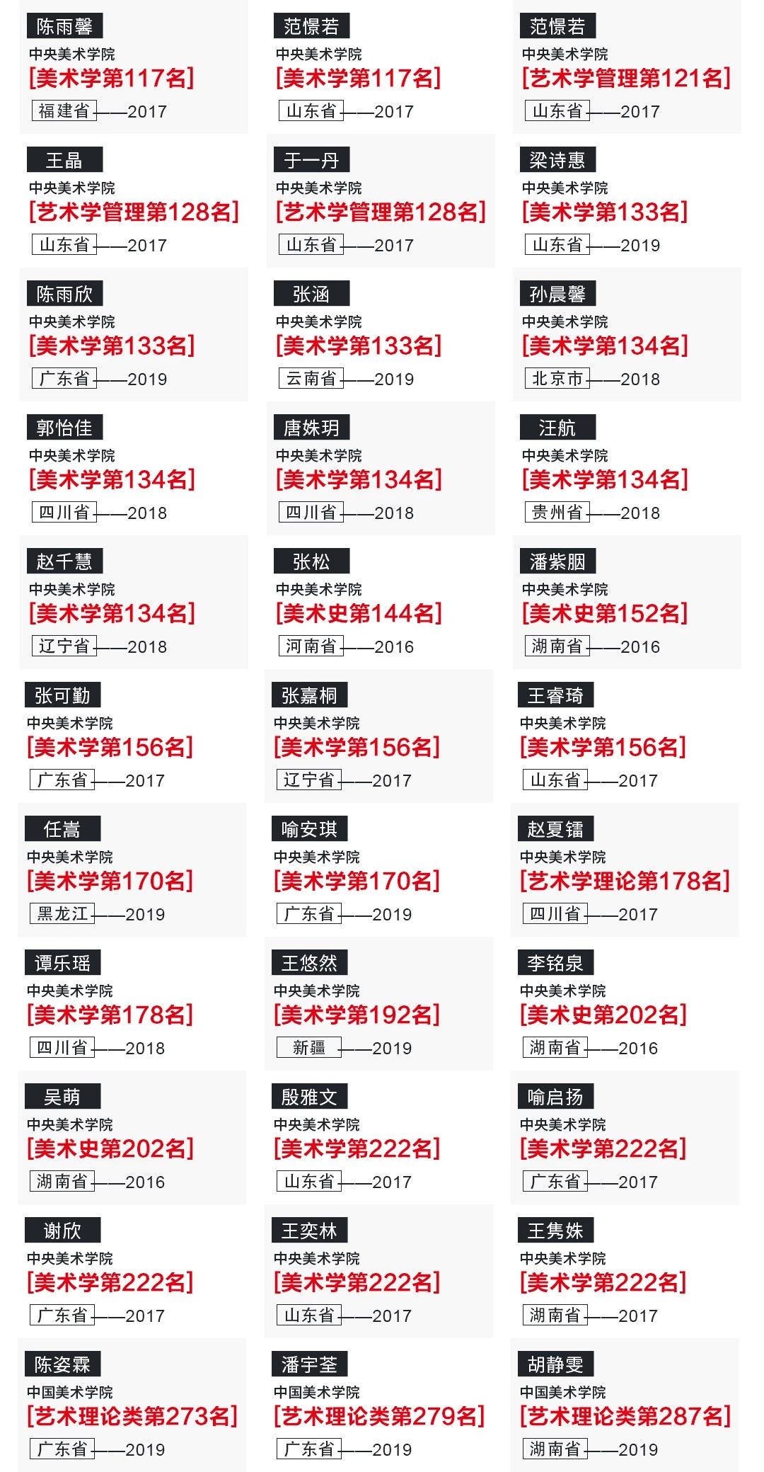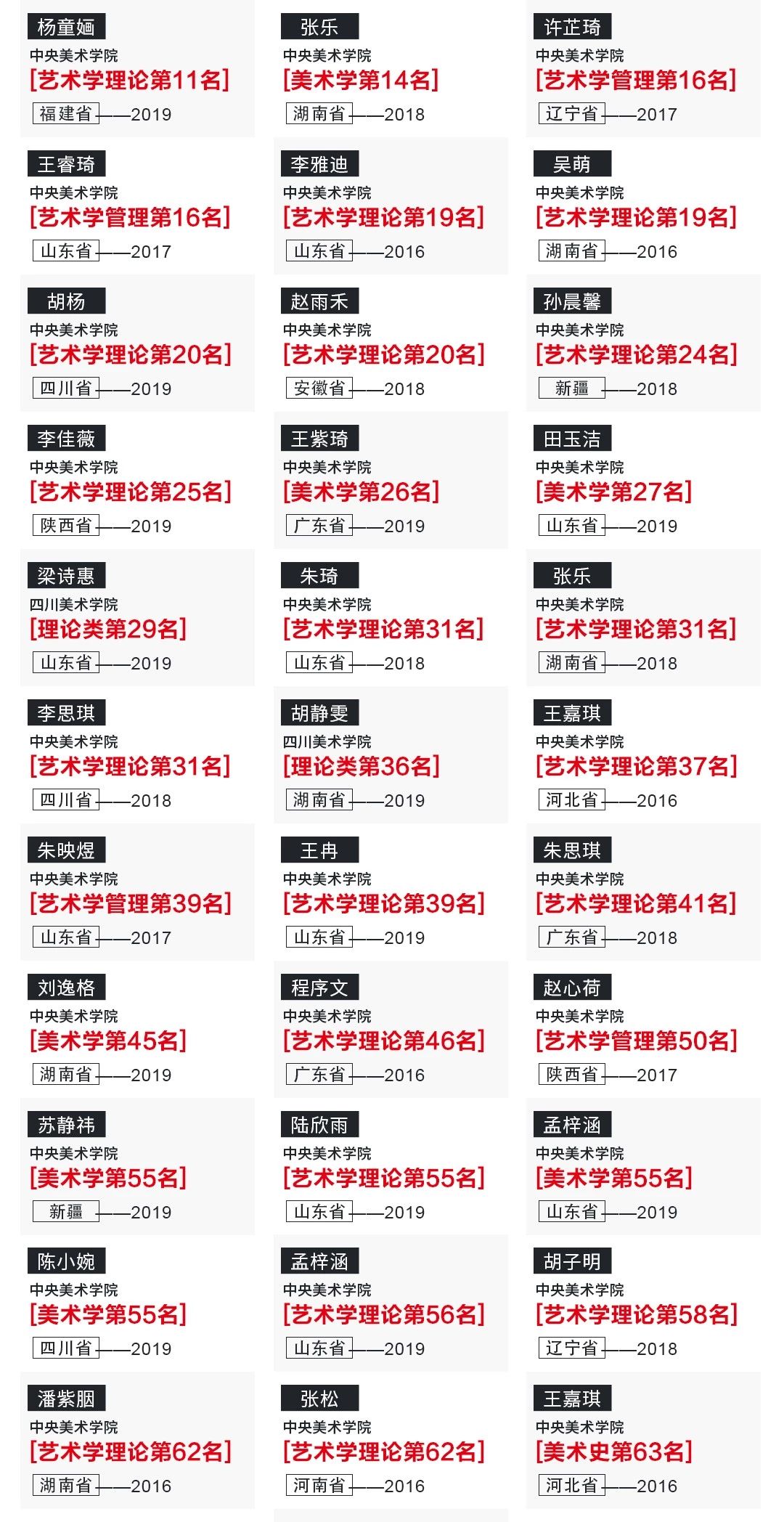 成功軌跡在中法學院成立之前,對史論類專業的重視程度逐年上升趨勢,2019年,史論類(藝術學理論、美術學、理論類)拿證70余張,斬獲狀元、榜眼等優秀成績。
