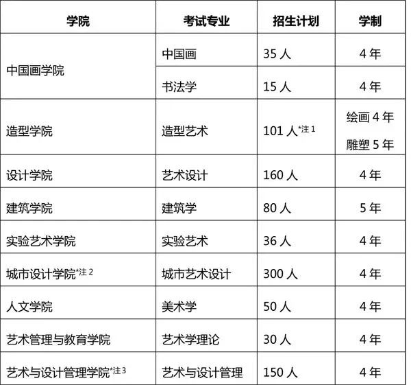 2020年招生總計劃957人,中國畫35、書法學15、造型藝術101、藝術設計160、建筑學80、實驗藝術36、城市藝術設計300、美術學50、藝術學理論30、藝術與設計管理(中法合作辦學)150人。