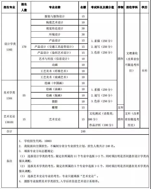 2019年招生總計劃980人,其中書法類20(含天津2人)、繪畫類410(含天津55人)、設計類430(含天津70)、史論類60、數字媒體藝術(中英合作)60(只招高考英語科目考生)。
