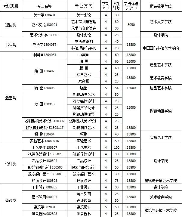 2020年招生總計劃1692人,繪畫設計類1488、書法類24、美術理論類40、服裝表演類48、風景園林48、工業設計24、文化產業管理20人。
