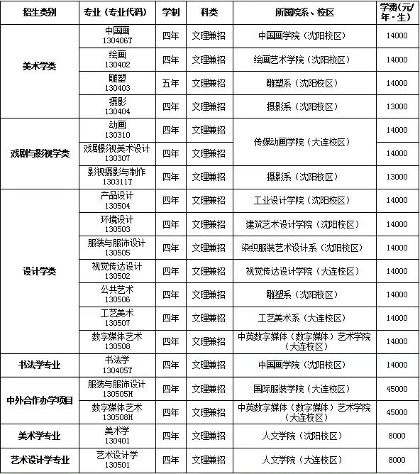 2019年招生計劃1676人(遼寧804、省外872),美術學類:省內115、省外125,戲劇與影視學類:省內140、省外152,設計學類:省內400、省外434,中外合作辦學項目:省內115、省外125,書法學專業:省內10、省外10,美術學專業:省內24、省外26。