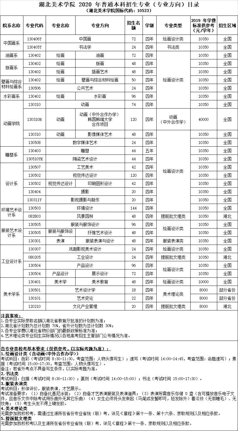 2020年湖北美術學院各專業及招生人數