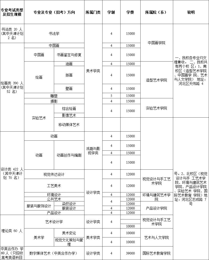 2020年招生總計劃952人,其中書法類20(含天津2人)、繪畫類390(含天津52人)、設計類422(含天津70)、史論類60、數字媒體藝術(中英合作)60(只招高考英語科目考生)。