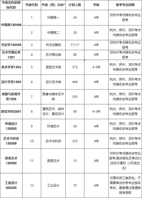2020年招生總計劃1776名,高水平運動隊招生10名、面向浙江省招收「三位一體」綜合評價本科生70名,面向浙江省的普通類考生的工業設計專業75人,錄音藝術15人,書法類18人、藝術理論類80人,中國畫、造型藝術類、設計藝術類、圖像與媒體藝術類、建筑學、環境設計、藝術與科技等美術設計類1508人。