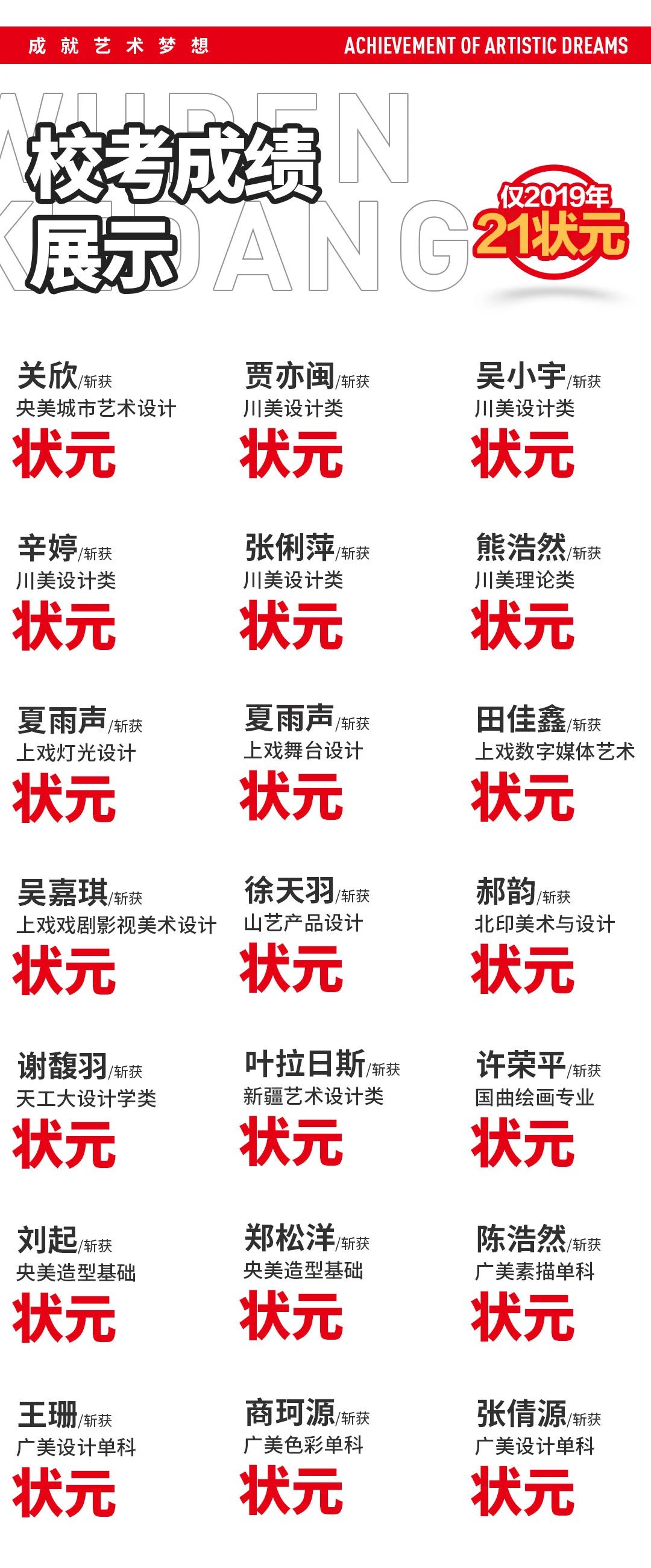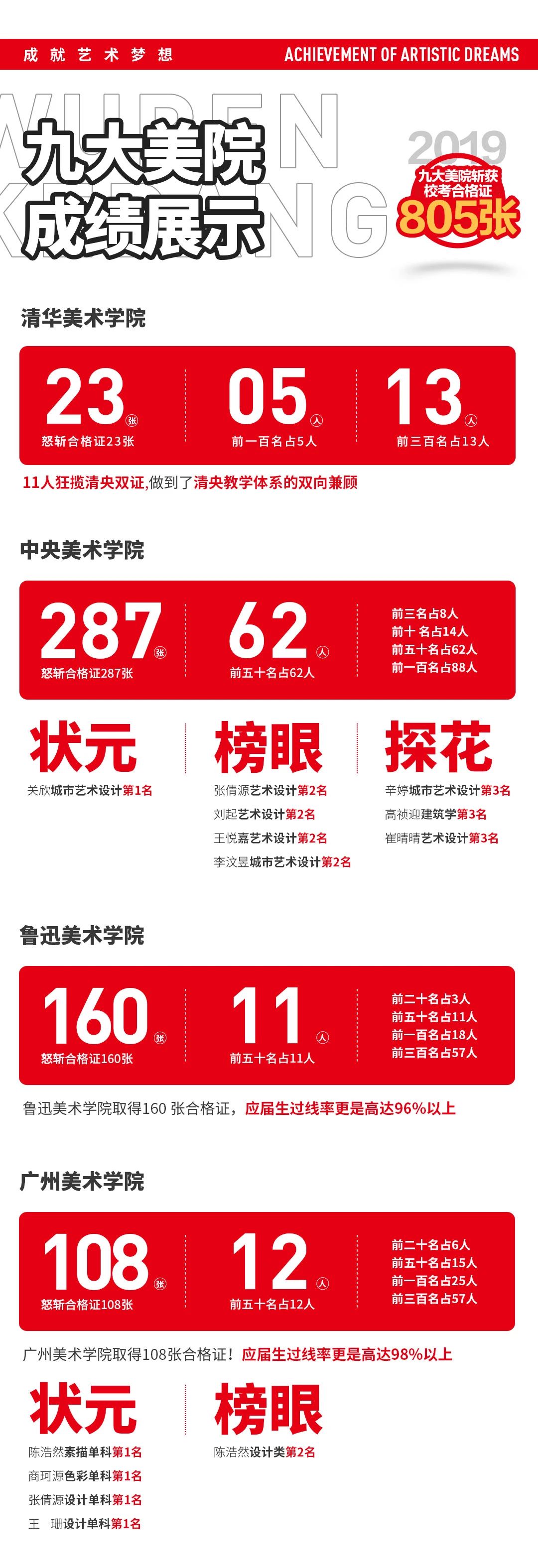 2019年,成功軌跡的本科升學率高達95%!在2019年的美術設計類??贾?,斬獲1170余張校考合格證,在同年的央美校考中,斬獲287張合格證,最終錄取108人的傳奇神話!這一切的成績離不開辛苦授課的老師們,同時更離不開為了夢想努力拼搏的同學們!