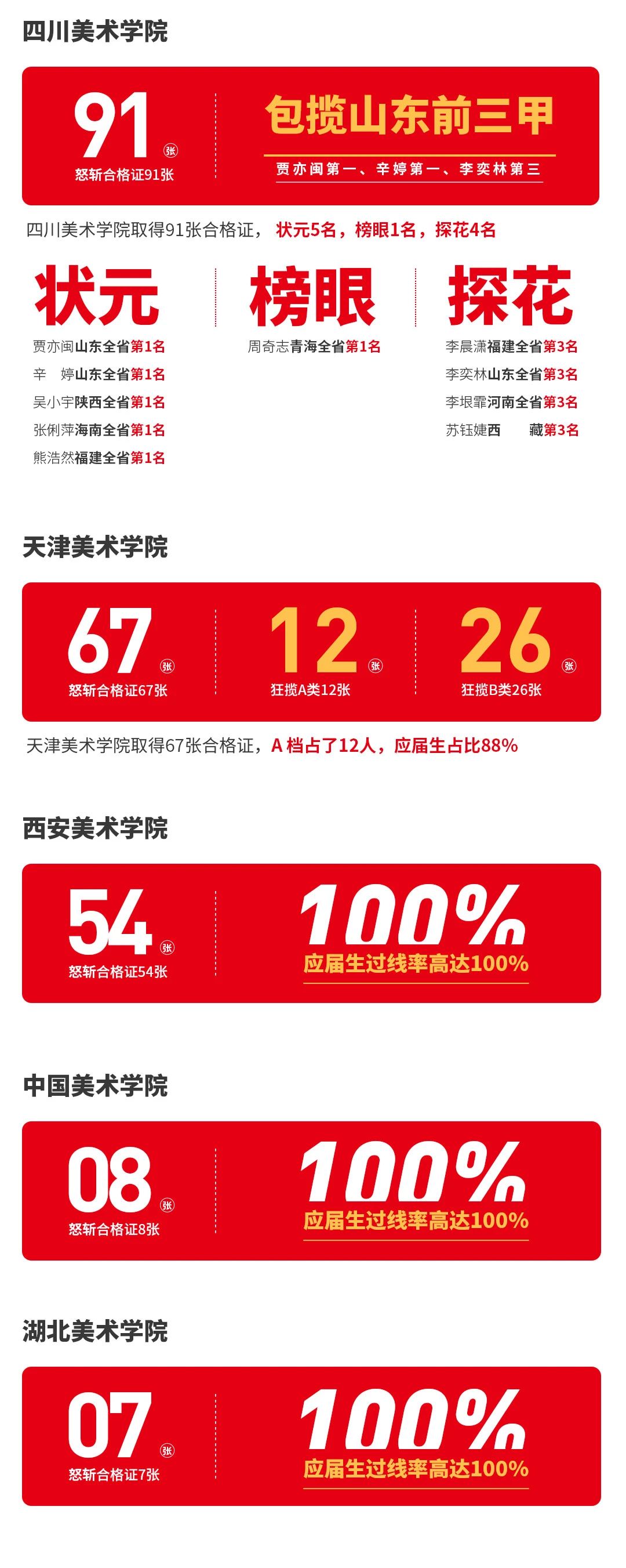 教學團隊秉承高校改革方向為指導方針,對一線教學數據進行教研開發和更新,提出精專度更高的教學方式,因此,歷年來的校考成績以平穩上升!收獲了多個高校的狀元,其中包括清華美院和中央美院的狀元。