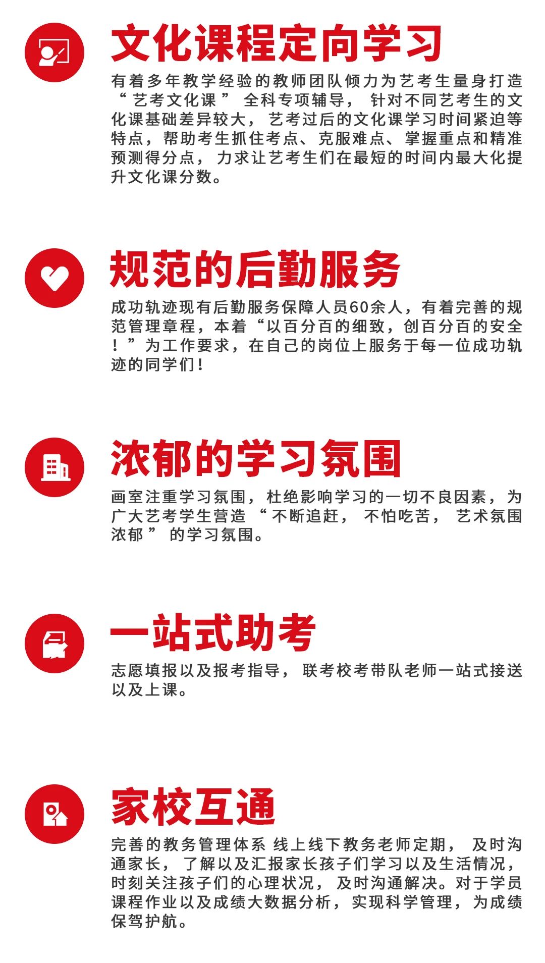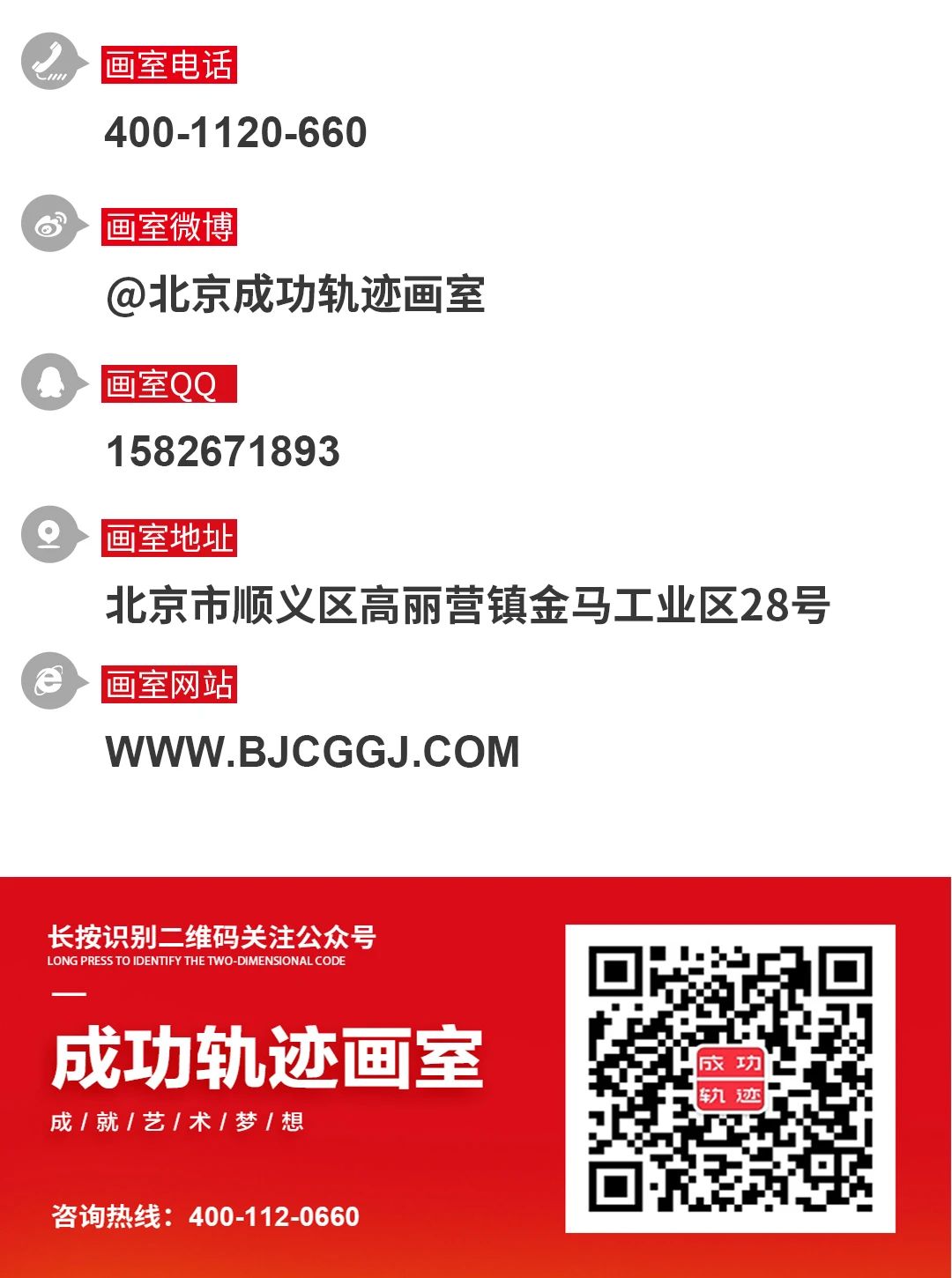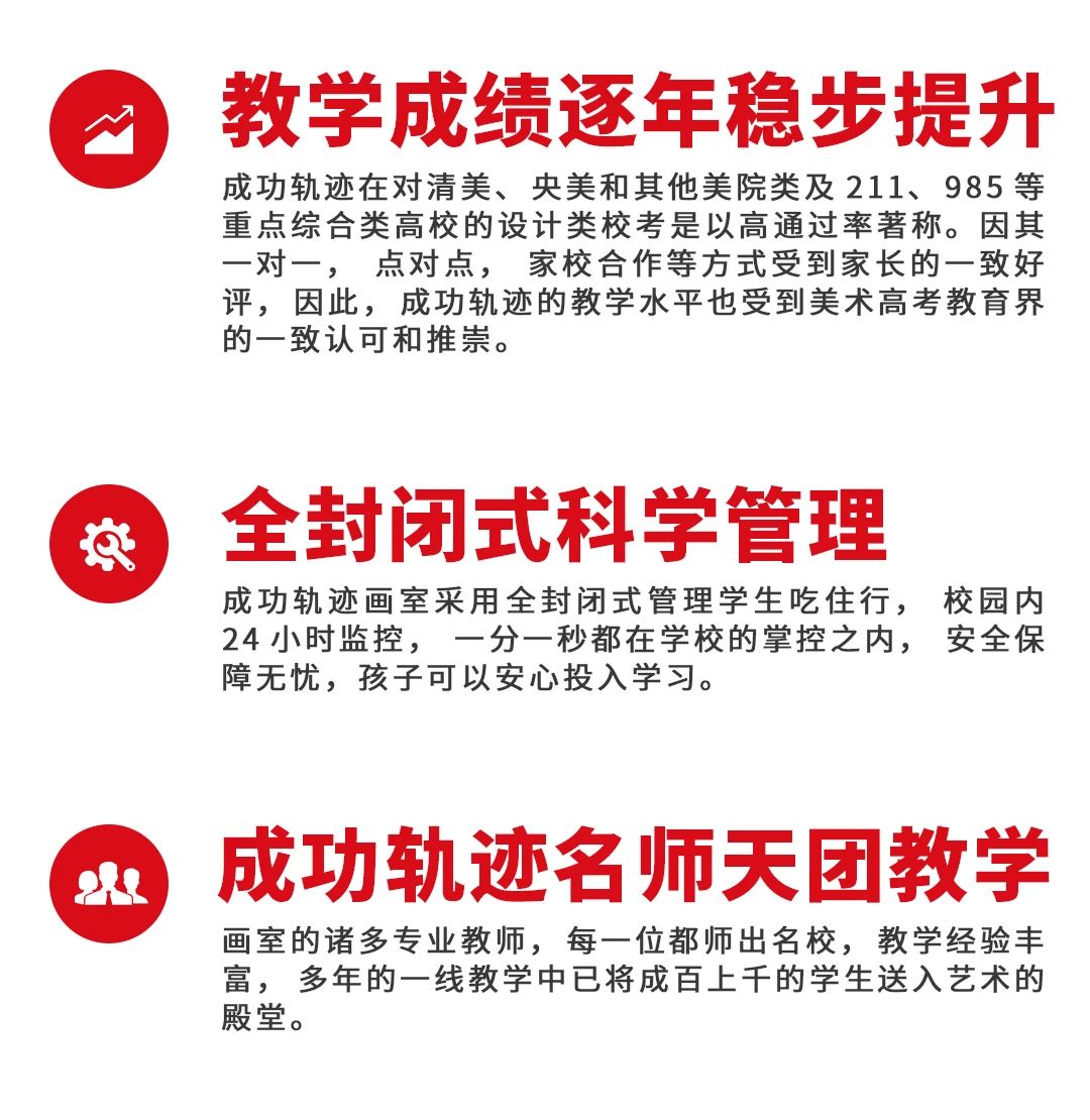 北京成功軌跡畫室成立于2005年,秉承著“打造中國美術高考教育設計類領導品牌”,始終以“人人都能上名校”為奮斗目標;15年來,“教育是有溫度的,教育是用生命點燃生命,夢想點燃夢想的過程!”這句話深深的烙印在每一位成功軌跡人的精神中;