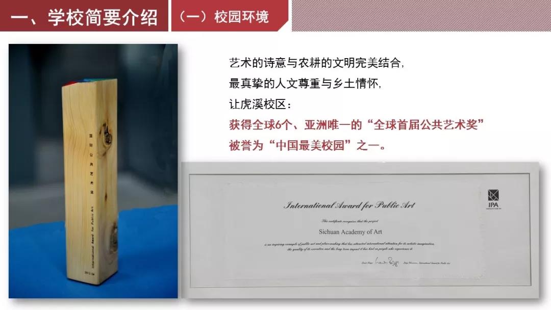 座落在重慶的四川美術(shù)學院,作為亞洲唯一代表榮獲首屆“全球公共藝術(shù)獎”,被媒體和社會譽為中國最美麗的校園之一。教育部本科教學工作審核評估專家組指出,四川美術(shù)學院作為西南地區(qū)唯一一所高等美術(shù)學院,歷史輝煌,成就卓越,藝術(shù)英才輩出,社會影響廣泛,是一所特色鮮明、水平一流、能夠代表重慶乃至中國藝術(shù)走向世界舞臺的高等藝術(shù)院校。