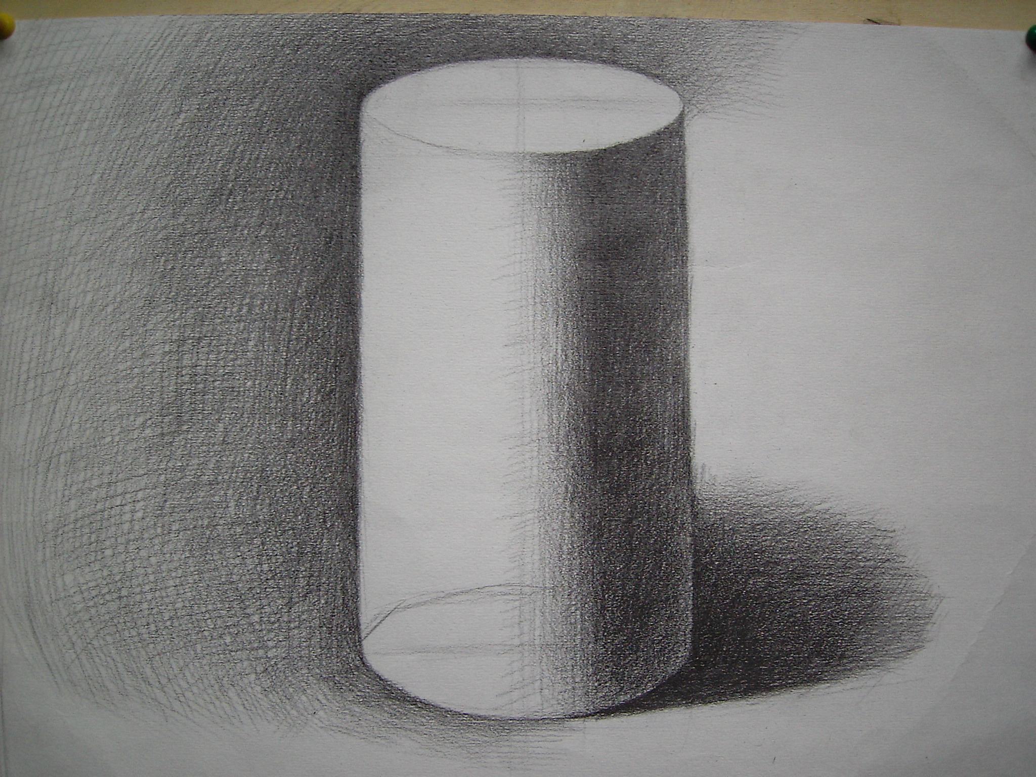 由于圓平面的垂直重疊。因此從一定的方向觀察,其頂面的消失線與底面的消失線交于地平線的消點上,產生了底面與頂面的面積透視縮減的區別。值得注意的是,石膏圓柱的圓底和(頂面)向后轉過去的轉角處,它很容易被誤認為是直角轉折,從而看不到它其實是前面較長的半圓面至后面半圓面的圓形沿伸,也是圓透視的重要深度的圓形邊。請大家務必要著重注意。