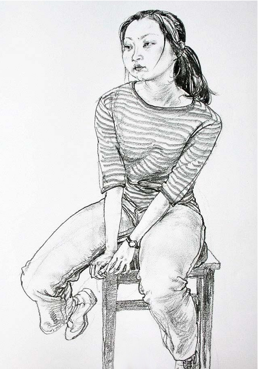從文藝復興幾位大師的素描和他們的其他作品中我們看到了一種以對象為出發點和樞軸點、最后又回到對象的藝術觀念。這種藝術觀念的表現形式是“線性素描”。關于那個時期的線性素描,我們容易得到以下一些認識:1) 線性素描用于研究對象的“織理”及其特征。2) 對象的“織理”及其特征可以在直觀中被把握,并且可以用線條(輔以少許調子)直接表現出來,不需要經過“分面”這樣一種循序漸進的過程。 3)在直觀中需要能夠區分“本質性”內容和“非本質性”內容,描繪的時候保留前者而舍棄后者。4) “本質性”內容包括形體的“團塊”以及“團塊” 與“團塊”之間的關系。5)面的結束和開始形成線條,因而“團塊”之間的關系可以用線條來很好的表達。6)因而不存在獨立的線條,每一根線條都有自己的歸屬度,或者歸屬于形體,或者歸屬于背景。7)線條有受光和背光之分,受光的線(也就是受光的消失的面)淺,而背光的線(也就是背光的消失的面)深。8)通過線條描繪團塊的邊界及團塊之間的關系,一個個的團塊組合成新的形體(比如手臂),然后一個個形體組合成完整的人物形象。線性素描的塑造過程是從局部到整體推進的。9)不以對象為出發點的“處理”(比如畫面虛實處理以及黑白灰處理)要盡量少。10) 最終的目的是為了“回到對象本身”,撇開“分面”,撇開畫面處理,是為了讓對象本身“說話”。11) “回到對象本身”以后,對象的“織理”會被揭示出來,它將給予畫面一種真正的力度感,并且可以引向藝術創造的源頭。