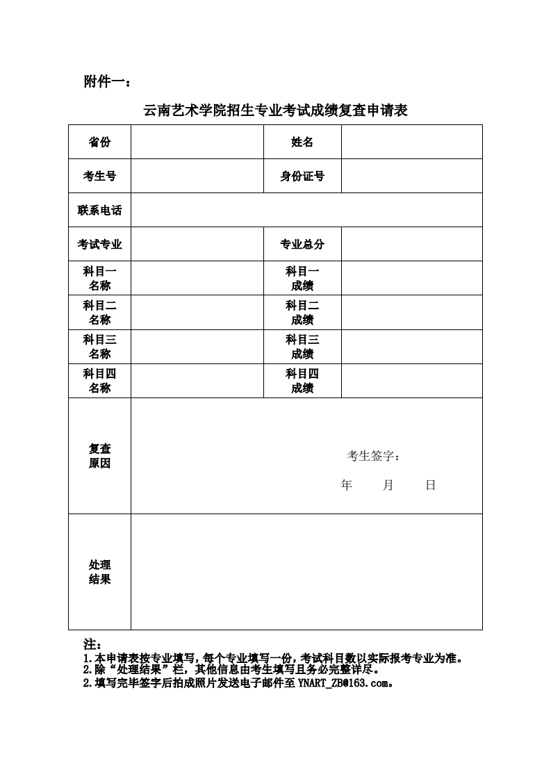 四、考生應嚴格按照附件格式要求填寫成績復核申請表,并經本人簽字后拍照發送電子郵件至YNART_ZB@163.com。