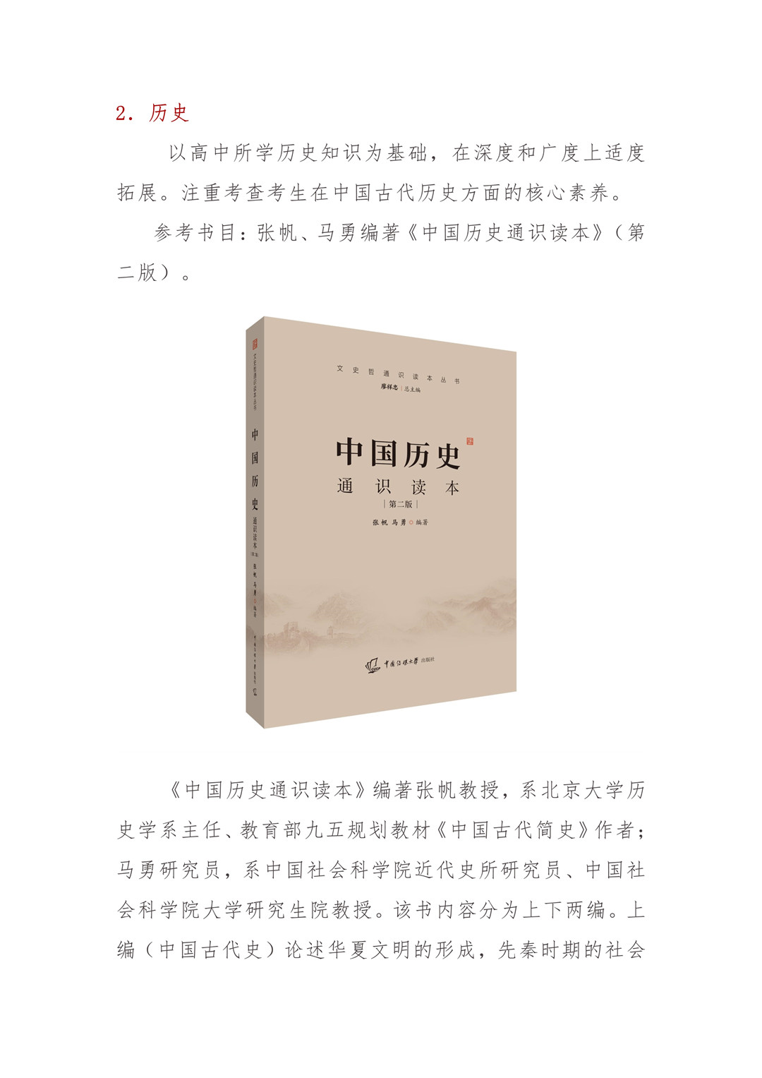 2.歷史以高中所學歷史知識為基礎,在深度和廣度上適度拓展。注重考查考生在中國古代歷史方面的核心素養。參考書目:張帆、馬勇編著《中國歷史通識讀本》(第二版)。
