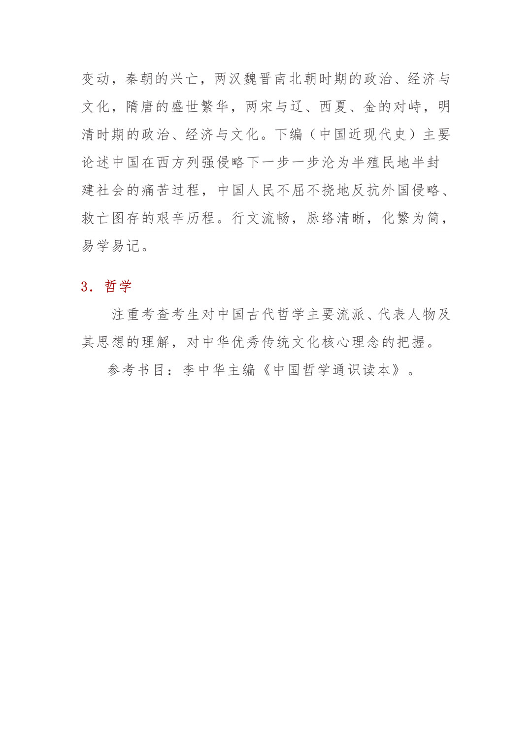 3.哲學注重考查考生對中國古代哲學主要流派、代表人物及其思想的理解,對中華優秀傳統文化核心理念的把握。參考書目:李中華主編《中國哲學通識讀本》。