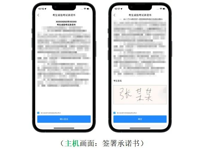 輔機正常進入直播考場后,主機自動彈出《考生誠信考試承諾書》,請考生仔細閱讀,確認無誤,勾選【我已閱讀并承諾誠信參加考試】,并在手機上簽字確認。
