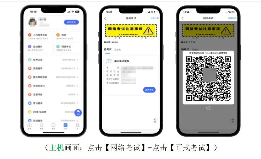 1.主機登錄:考生使用主機登錄“藝術升”APP,在【首頁】或【報考】點擊【網絡考試】,點擊右上角【設備檢測】對設備進行【重新檢測】(說明:在進行“拍照檢測”時,隨意拍攝一張照片即可),設備通過檢測后選擇“中央美術學院2023年本科招生初試”,點擊【正式考試】。主機自動彈出二維碼供輔機掃碼登錄使用。