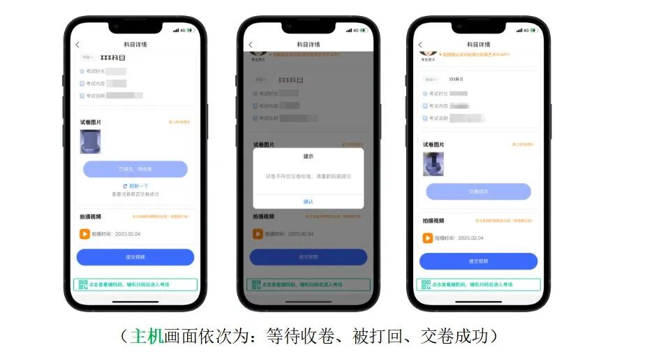 2.請考生關注收卷狀態,試卷照片不完整或不清晰將會被監考員打回,考生須重新拍攝,重新點擊【交卷】,直至交卷成功。交卷過程須在輔機監控下進行。